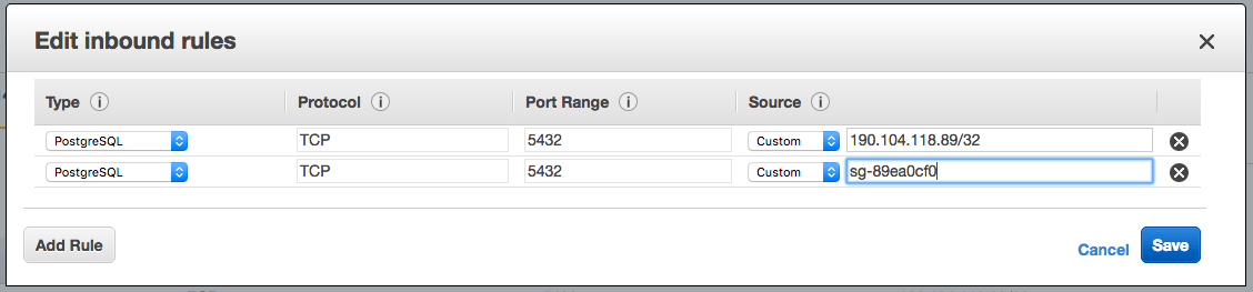 After the instance is being created we will navigate to our EC2 security groups and add a small change for our EC2 instances to be able to connect to RDS. First copy the security group name we just defined, namely gitlab-ec2-security-group, and edit select the RDS security group and edit the inbound rules. Choose the rule type to be PostgreSQL and paste the name under source.