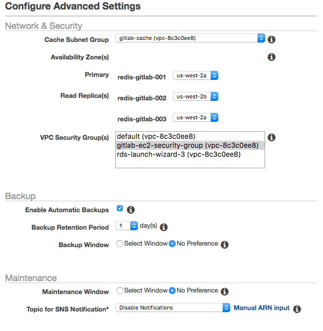 The rest of the setting on this page request a DB identifier, username and a master password. We've chosen to use gitlab-ha, gitlab and a very secure password respectively. Keep these in hand for later.